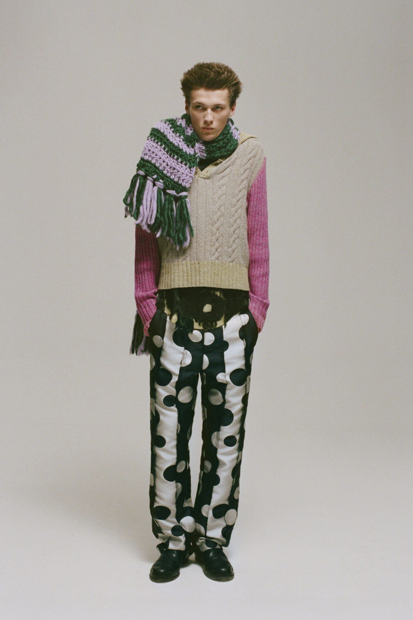 Surprising but delightful were the upholstery-like jacquards and textured florals that came from a reject pile of fabrics Cuming found in his studio, transformed into comfy-looking hoodies and stretch-cuffed pants. “I want to challenge ideas of what’s tasteful or what’s palatable and kind of push sometimes a little bit of ugliness, especially when there’s a lot of neutrality in the world at the moment.” He got that balance of crudeness and consideration just right.