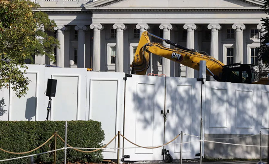 Construction equipment is visible behind temporary fencing at the White House East Wing site as litigation over the planned ballroom project moves forward in federal court.