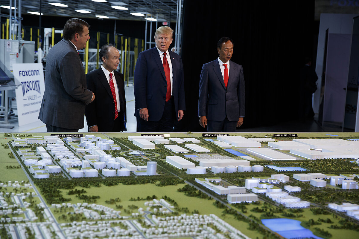 President Donald Trump tours a facility intended for use by Taiwanese cellphone manufacturer Foxconn, in Mount Pleasant, Wisconsin, June 28, 2018.